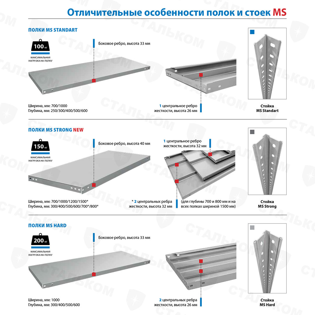 - Стеллажи Практик: MS Standart, Strong, Hard, Pro, U